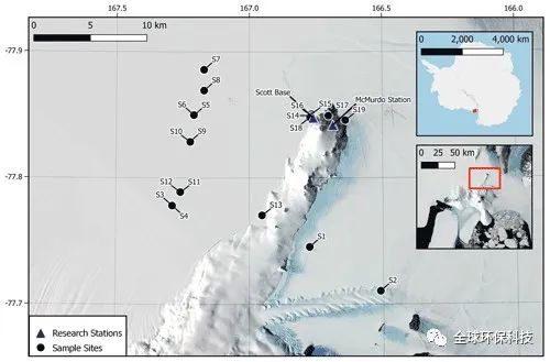 南极洲罗斯岛地区(S1-S19)雪样采集的地点。图源:科学杂志《冰冻圈》研究原文